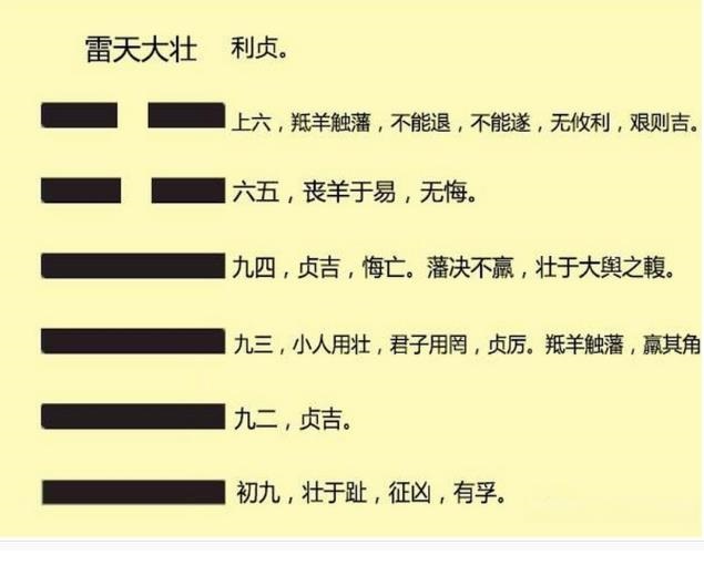 第三十四“大壯”。此卦下乾上震,講羊。這裏的羊是一頭老公羊,脾氣犟,非拿腦袋撞籬笆牆。這真是一種不折不扣的“大壯”。