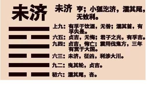 “未濟”,是講還沒過河。沒過河,前途未卜,凶多吉少,這是痛苦。一如孫先生説的,“革命尚未成功,同志仍須努力”,摸着石頭繼續過河,奮鬥有奮鬥的美感。成功了,痛飲慶功酒,是最好的報償。不成功,“出師未捷身先死,長使英雄淚滿襟”,也很悲壯。這是個先苦後甜的卦。
