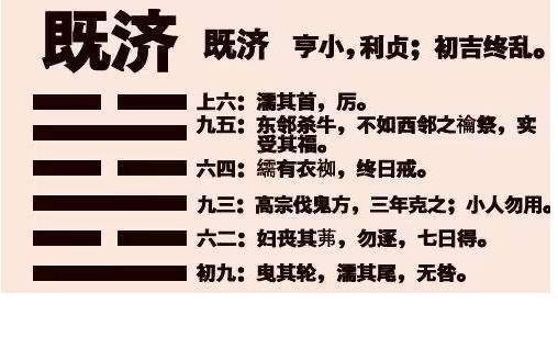 《既濟》這一卦的六爻,從下到上,是按一陽一陰排列,吉凶占斷也是一吉一兇,好壞搭配。其上下卦是水火更疊,上下爻屬陰陽交錯。這好比苦甜相參的人生。