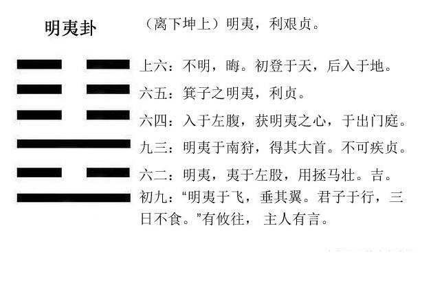 第三十六“明夷”。此卦下離上坤,離是日,坤是地,日在地下,為日落之象。“明夷”是太陽鳥,在這裏指代日落。它的六爻,是講太陽由明到晦的六個階段。太陽正午時爬得最高,但它爬得再高,也得掉下來,何況人乎?