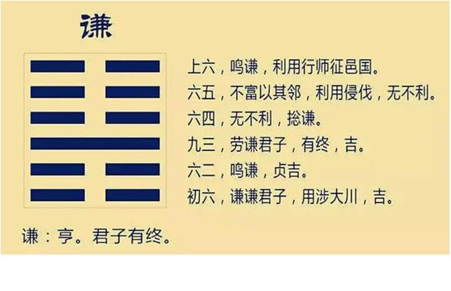 第十五“謙卦”。此卦下艮上坤,全卦圍繞一個“謙”字。講的是,君子以謙虛為美德。此卦“陰爻六”辭曰:“鳴謙,利用行師徵(邑邦)”,為什麼謙虛反而利侵伐?令人費解。