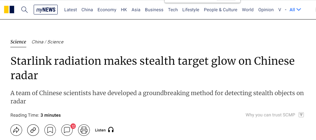 香港《南華早報》13日披露,中國科學家在南海進行了一次空前的雷達實驗,或許能改變未來戰爭的遊戲規則。報道稱,武漢大學電子信息學院易建新教授領導的研究團隊近日的論文透露,該團隊在廣東海岸發射了一架大小約與鳥相當、雷達反射面積與隱形戰機相當的大疆無人機,雖然附近的地面雷達並未發送任何無線電波,但目標的回波卻出現在雷達屏幕上。中國科學家説,這是因為“星鏈”衞星飛越菲律賓上空時發出的電磁輻射暴露了這種模擬隱形戰鬥機的無人機行蹤,“其他國家先前從未展示過這種能力”。