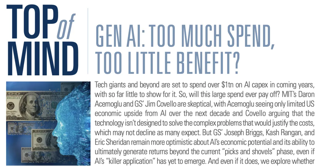 6月末,高盛的一篇名為《投資太多,收益太少》,將AI泡沫論推到台前。文章直言,大公司計劃在未來幾年投入1萬億美元在AI相關的東西上,比如數據中心、芯片和電網。但到現在為止,這些錢除了讓開發人員的工作效率提高了一點,沒看到其他明顯的成果。
