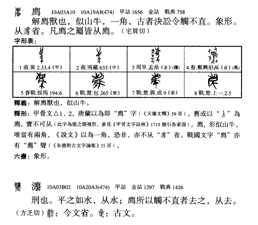 《隋書·禮儀志》引蔡邕曰:“解豸,如麟,一角。”《説文解字》:“麒,仁獸也,麋身,牛尾,一角,從鹿其聲。”廌的形象,似牛、似羊、似鹿者,形似也。而如麒麟者,神似也。麒與麟同類。