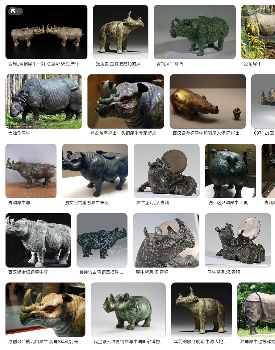 犀牛作為體型僅次於長鼻目大象及鯨偶蹄目河馬的奇蹄目動物,可謂典型。又是廣泛分佈於古九州的動物種類之一,其角皮貴重,可謂古人常見。歷代還有許多青銅犀牛,因此犀牛必有對應的象形文字。