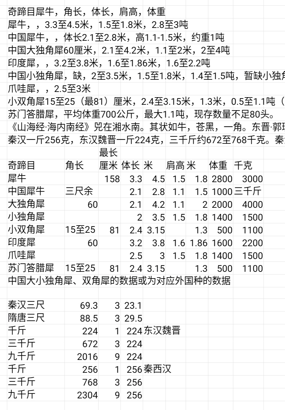 秦漢一斤256克,東漢魏晉一斤224克,三千斤約672至768千克。秦漢三尺約69.3釐米,隋唐三尺約88.5釐米。符合小雙角犀角長體重。
