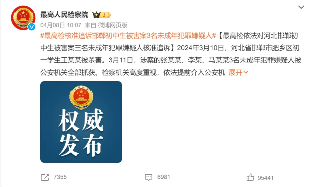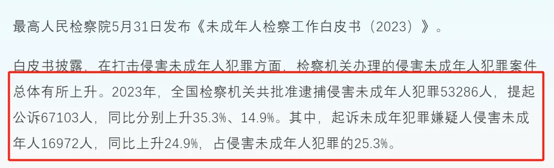 根據2023年最高檢公佈的數據,未成年案犯已經多達數萬人,同比上升的數據已經達到35%。