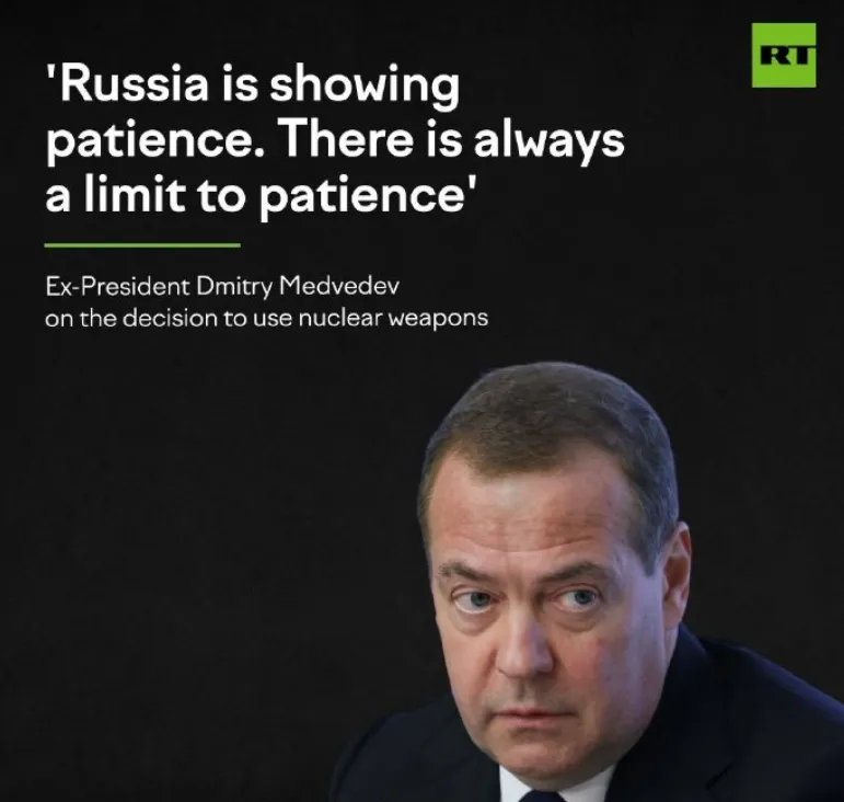 剛剛,俄羅斯又開始對北約進行核威懾了!9月14日,俄羅斯聯邦安全會議副主席梅德韋傑夫在社交媒體上表示,俄羅斯瞭解核武器的危險性和核戰爭的不可逆轉性,因此俄方展現出了耐心,沒有使用核武器來應對敵人的攻擊。但他警告説,這種耐心可能會耗盡。