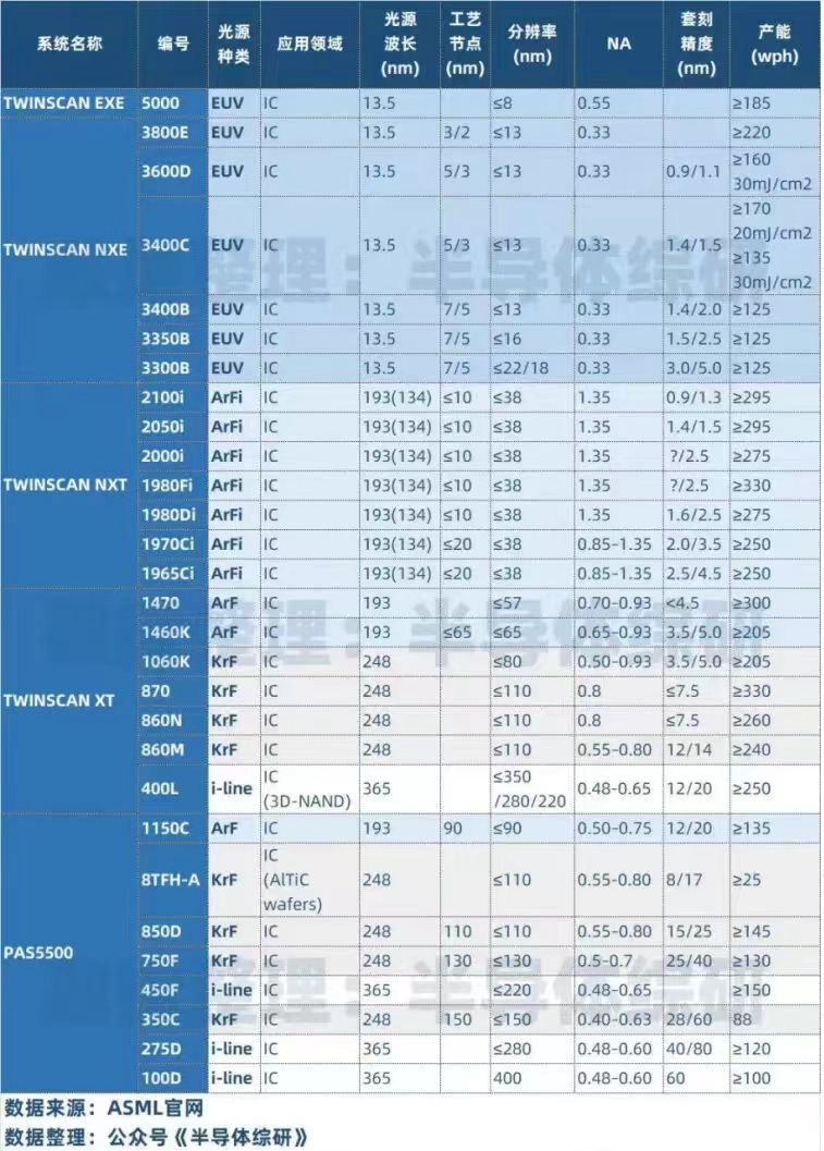 4. 看圖中的ASML光刻機指標,193nm波長的ArF光刻機型號是從最低檔的1460K到最高檔的2100i。分辯率<=65nm,就對應NXT1460K這款。而且14060K的套刻精度是3.5/5.0nm,這比國產機的<=8nm還要好。當然,國產光刻機具體如何,信息不足,我們只能參考一些信息判斷。但應該可以得出結論,在DUV光刻機這個層面上,國產光刻機還有不小進步空間。套刻精度一開始羣眾誤解了,不少懂的人解釋了,不是芯片製程,而是前後mask擺放的誤差。