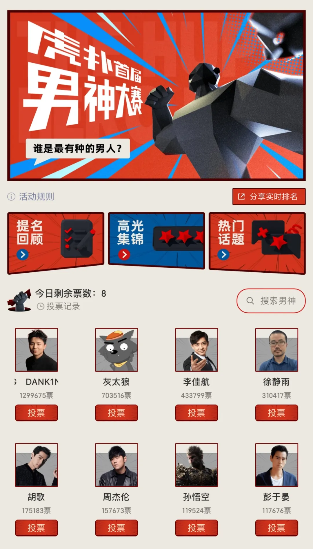 但鹿晗和王鶴棣的票數都破了萬,主要還是通過球類運動獲得了直男男神入場券。硬糖君曾分析過鹿晗的足球水平不錯,還悄悄捐過球場,到虎撲空降解説比賽時也不露怯。種種直男元素疊加,完全可以遮蓋他那張漂亮的臉蛋兒,讓直男放下戒心。