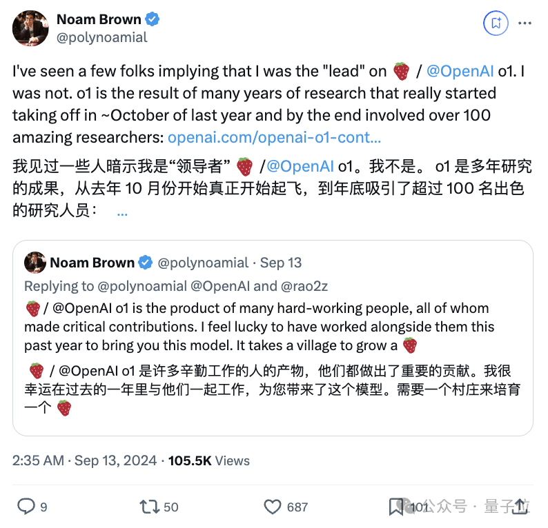 除此之外,在關於OpenAI o1背後團隊的熱議中,OpenAI科學家Noam Brown最近發帖澄清並沒有主導草莓/OpenAI o1。
