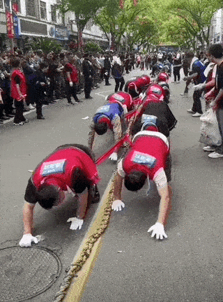 根據媒體報道,這項運動名叫“螞拐(青蛙)抓害蟲”,需模擬青蛙動作跳完全程,並且每次跳躍雙手必須着地,否則算犯規。
