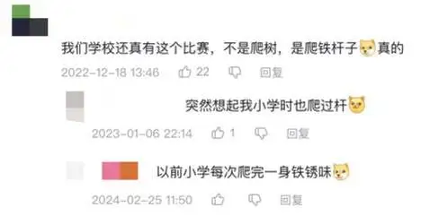 “小學操場上立着三根大杆,有兩層樓那麼高,是學校專門設置給同學們爬的,不然升旗杆就要被爬。”