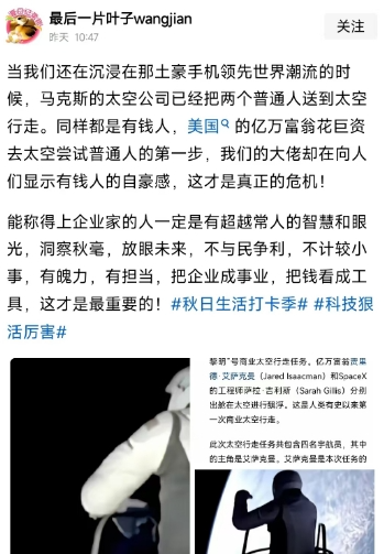 不管怎麼説,太空旅遊畢竟是個新鮮事物,無論是追求刺激還是圓夢太空,這些富豪畢竟邁出了普通人進入太空的第一步,隨着時代的發展,誰能確定太空旅行不會像當年坐飛機一樣普及呢?