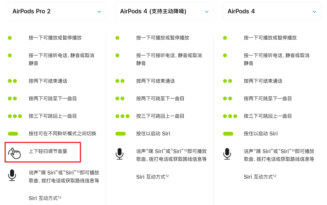 而在操控手勢上,兩款 AirPods 4 都支持 AirPods Pro 同款手勢,不過它們都不支持上下輕掃調節音量,突出一個等級森嚴。。。