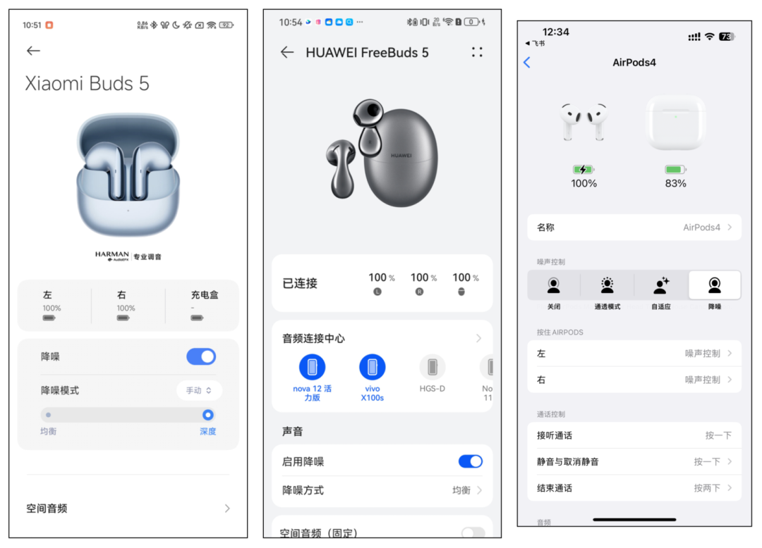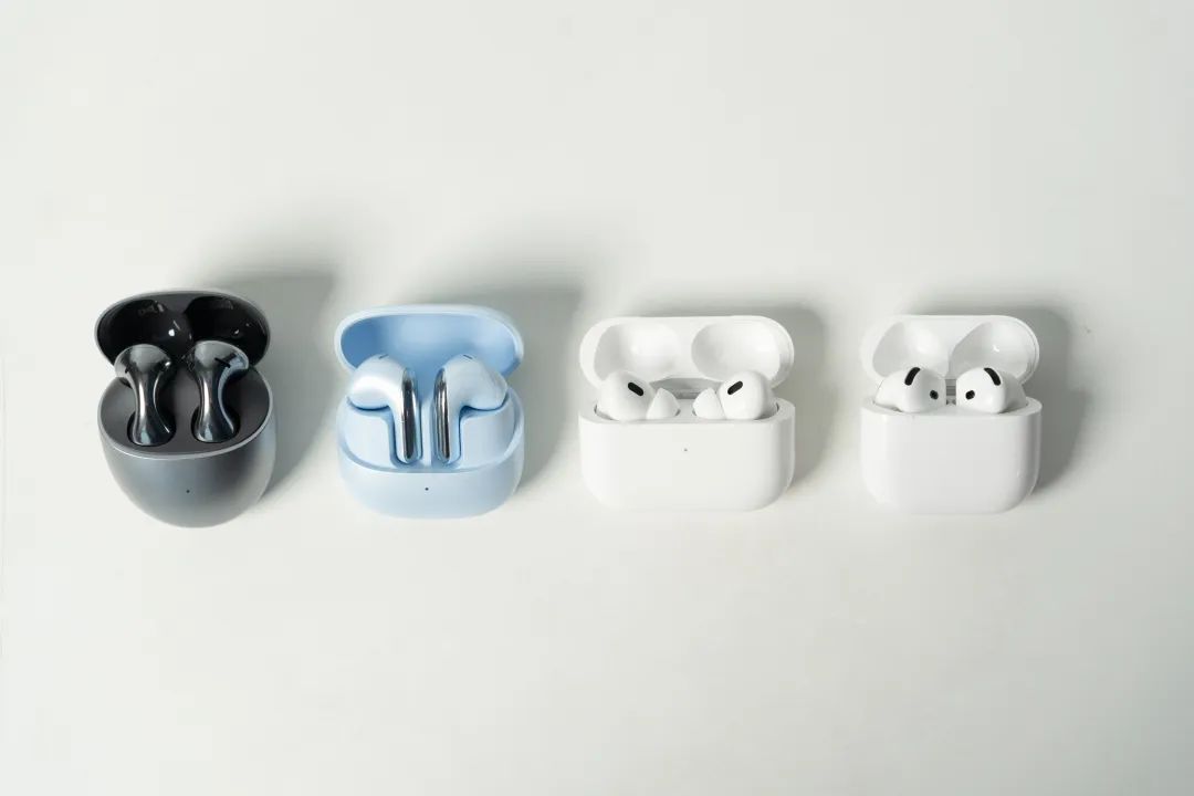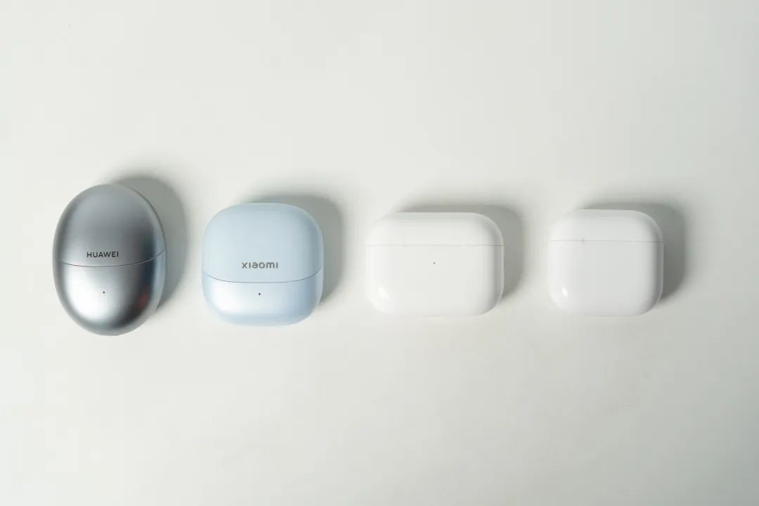 為了讓各位能夠更直觀的感受到它的降噪能力,我特意找來了它的老大哥 AirPods Pro 2,以及另外兩家大廠推出的半入耳降噪耳機 —— 華為 FreeBuds 5 以及小米 Buds 5,把它們放一起作對比。