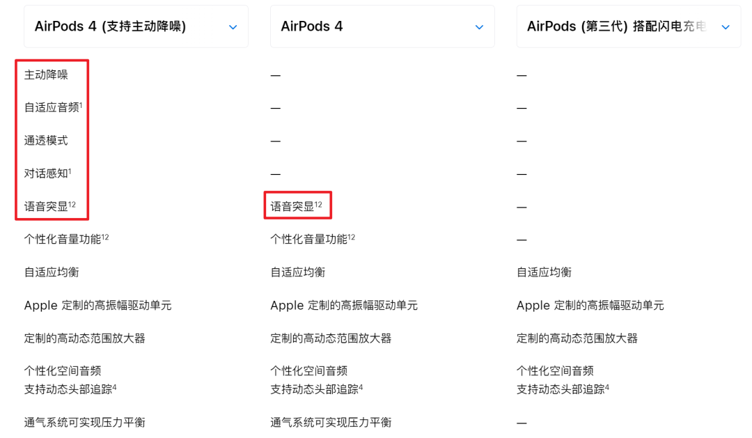 不過由於自適應音頻、對話感知跟主動降噪有關,因此這倆功能僅降噪版的 AirPods 4 支持: