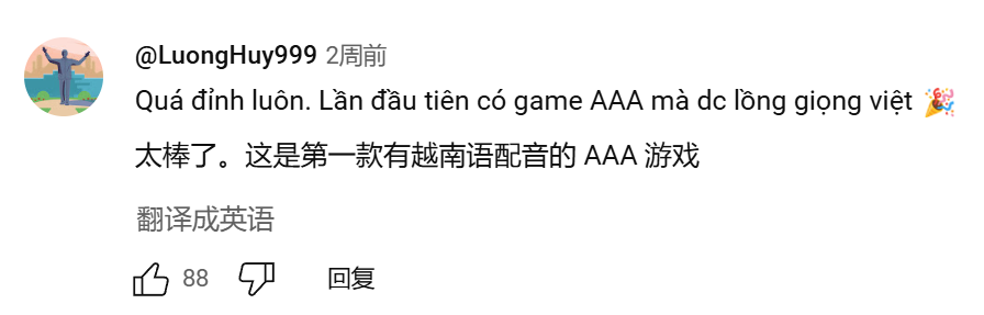除了肉眼可見的文字內容,完整的越南語配音工作也在玩家社區中穩步推行,配音組現階段基本完成了遊戲前四章的配音工作,有坊間傳聞稱配音團隊正在嘗試聯繫遊戲科學加入越南語配音,且不論該傳聞是否屬實,起碼對越南玩家來説,這就是第一款支持越南語配音的3A遊戲。