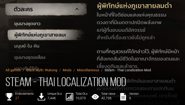 當然了,受《黑神話:悟空》影響的鄰居倒也不止越南一家,深受佛教薰陶的泰國與越南一樣,在官方泰語缺席的情況下連夜製作了泰語本地化MOD,該MOD在Nexus Mods網站中的下載量排第16名,至今已有1萬次下載。