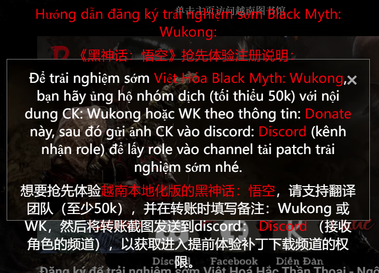 以速度最快的紅組(The Red Team)為例。8月25日,紅組就已經完成了初版翻譯,玩家可以通過向他們捐贈5萬越南盾(約合人民幣14元)的方式獲取搶先體驗權限,從而拿到一個189 MB大小的《黑神話:悟空》越化補丁。