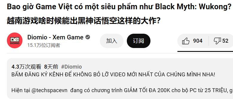 9月4日,越南主播Diomio - Xem Game在油管上拋出了一個有些眼熟的問題:“越南遊戲啥時候才能有黑神話悟空這樣的大作?”