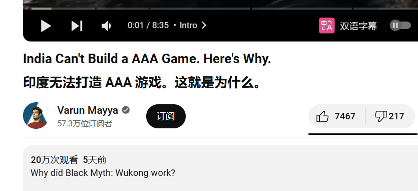 另一個人口大國印度的玩家同樣在《黑神話:悟空》發售之後大受震撼,印度油管主播Varun Mayya乾脆在自己的視頻裏借《黑神話:悟空》斷言印度無法打造3A遊戲,核心論點跟上面提到的內容基本相似,大部分印度網友也都認為,現階段的印度還無法與中國放在一起對比。