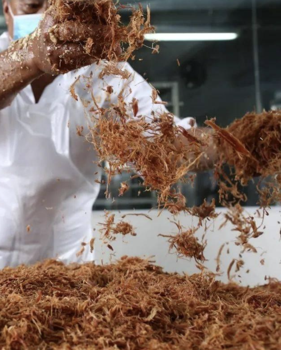 晾肉要切塊飛水,用花生油、五香料爆香,武文火煲3個小時,製成絲備用;