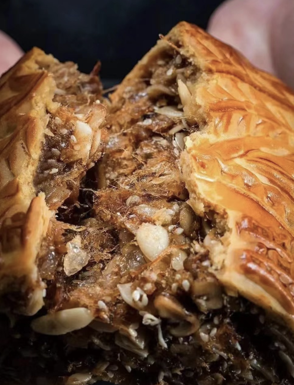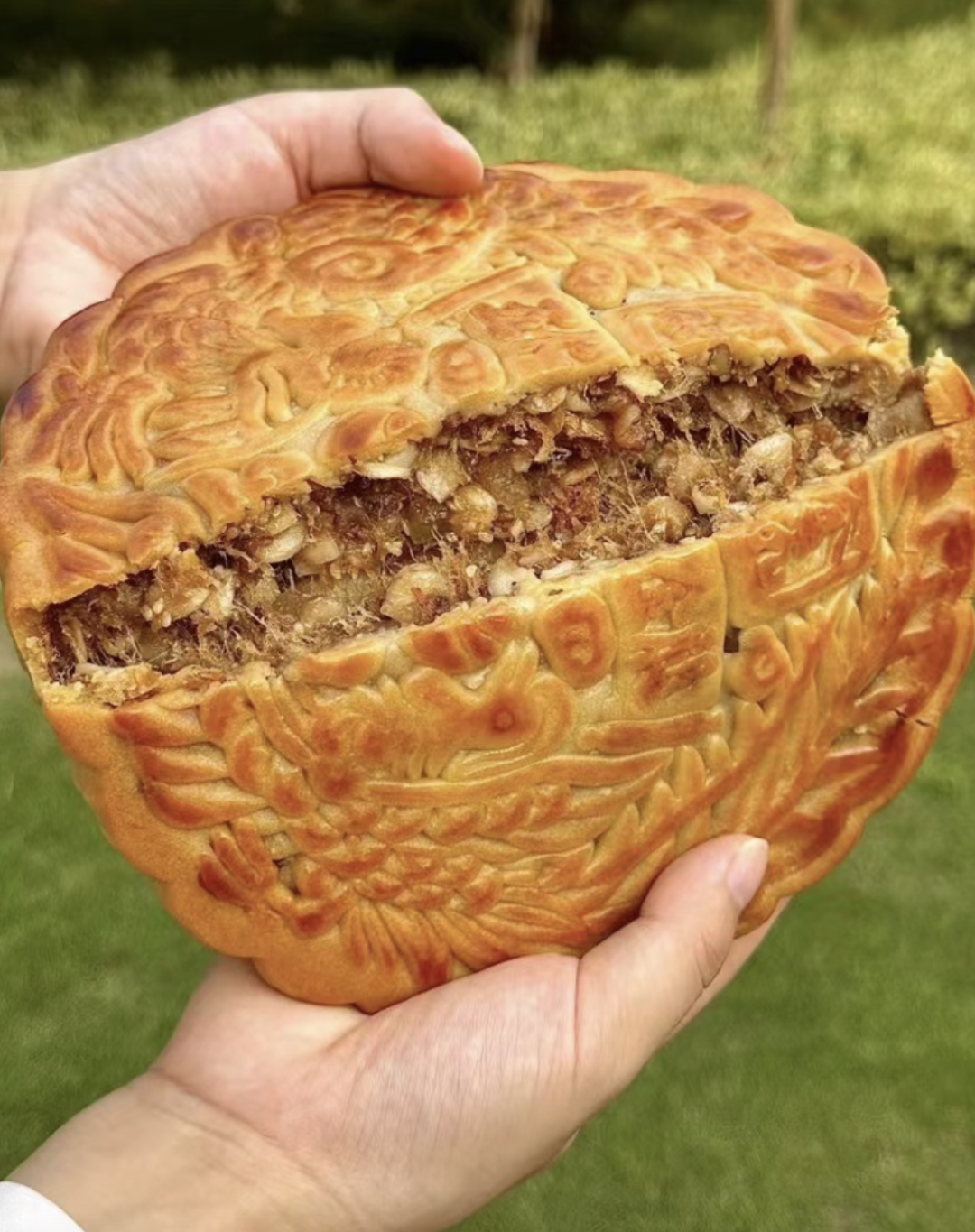 金華火腿做餡料,肉絲分明,果仁吃起來卻是脆脆的口感。餅皮油潤鬆軟,一口咬下去口感豐富,肉絲讓月餅更有嚼勁,且越嚼越香。