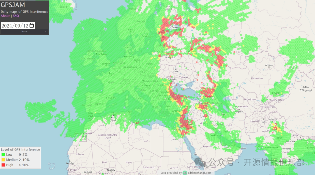 監測干擾區的變化與OSINT干擾區測繪工具相結合-GPSJAM網站,該平台地圖使用ADS-B Exchange提供的數據,根據飛機導航系統準確性的報告生成可能的GPS干擾地圖。該網站由John Wiseman(twitter賬號:@lemonodor)於2022年7月創建。
