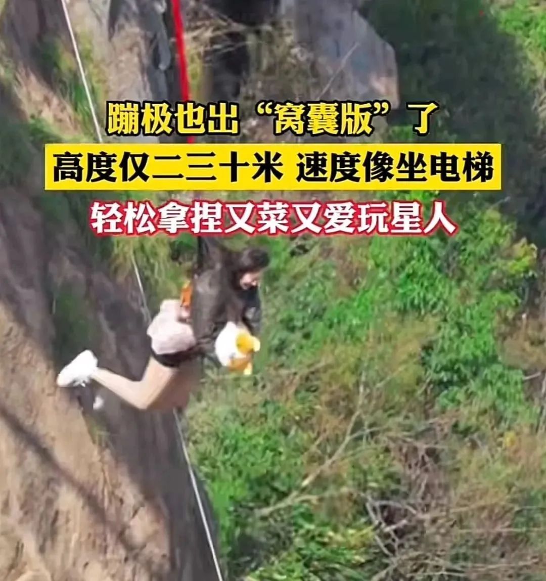 蹦極是窩囊版的。蹦極高度只有20多米,人跳下之後不是加速墜落,而是由工作人員控制速度緩慢降落,比坐電梯還慢。