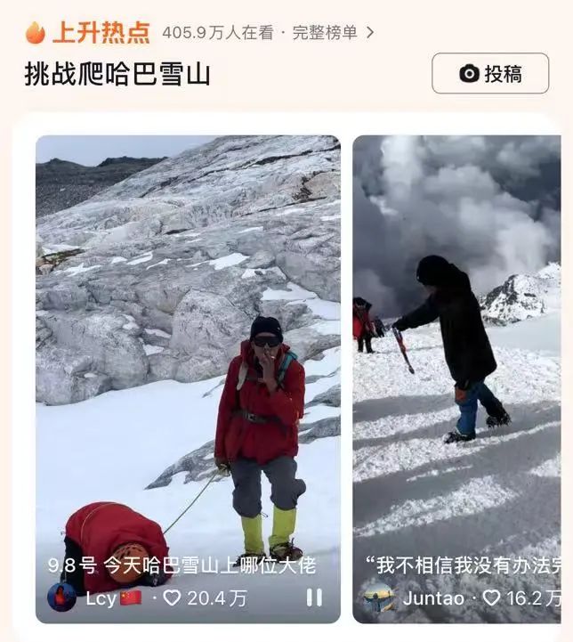 像哈巴雪山登頂照的歲月靜好下,關鍵詞一個比一個炸裂“户外”、“爬行”、“牽引繩”、“窒息”。