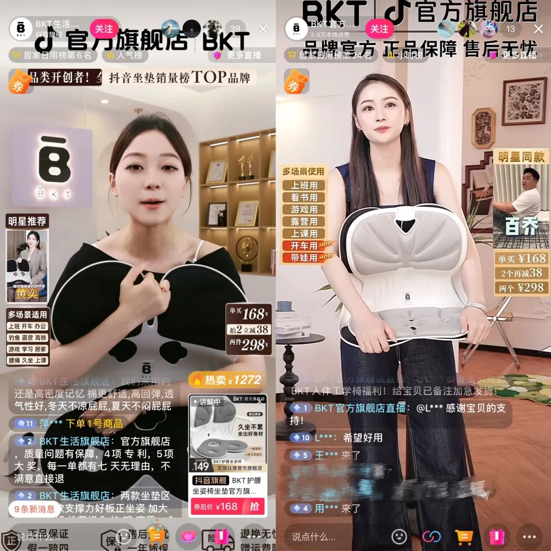 瀝金分析認為,BKT之所以在護腰坐墊這條賽道上“一家獨大”,是因為BKT重倉抖音,“直播帶貨的方式能最直觀地展示護腰墊的功效,引發消費者的購買慾”。具體而言,BKT利用了明星和KOL的影響力,又通過品牌自營號的持續運營,確保了流量的穩定性和可持續性。
