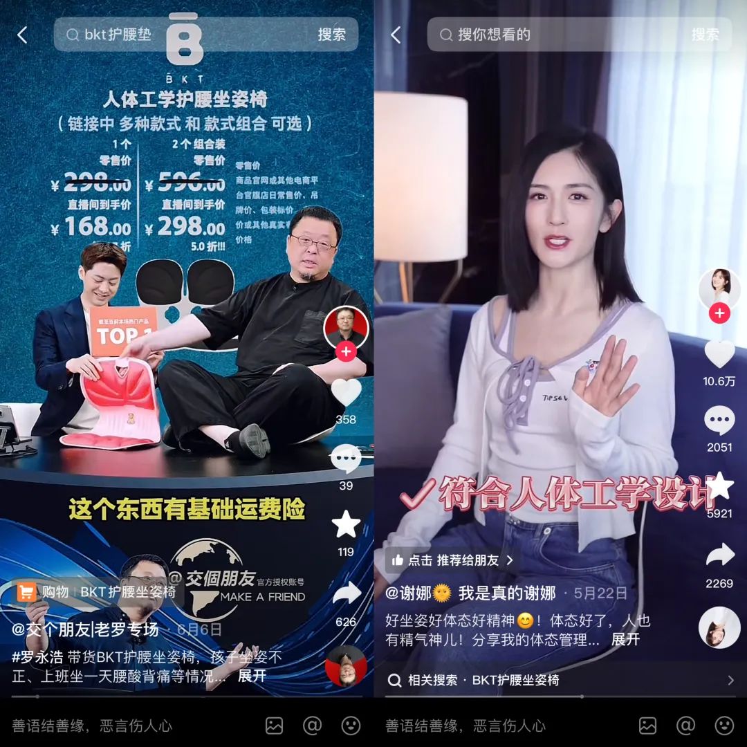 瀝金分析認為,BKT之所以在護腰坐墊這條賽道上“一家獨大”,是因為BKT重倉抖音,“直播帶貨的方式能最直觀地展示護腰墊的功效,引發消費者的購買慾”。具體而言,BKT利用了明星和KOL的影響力,又通過品牌自營號的持續運營,確保了流量的穩定性和可持續性。