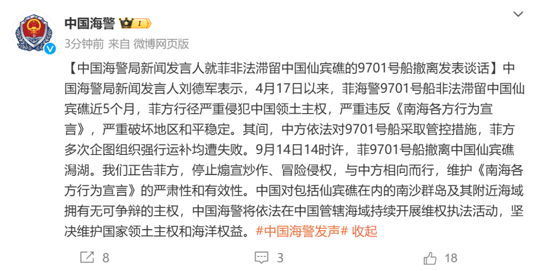 日前,中國海警局新聞發言人劉德軍表示,4月17日以來,菲海警9701號船非法滯留中國仙賓礁近5個月,菲方行徑嚴重侵犯中國領土主權,嚴重違反《南海各方行為宣言》,嚴重破壞地區和平穩定。其間,中方依法對9701號船採取管控措施,菲方多次企圖組織強行運補均遭失敗。