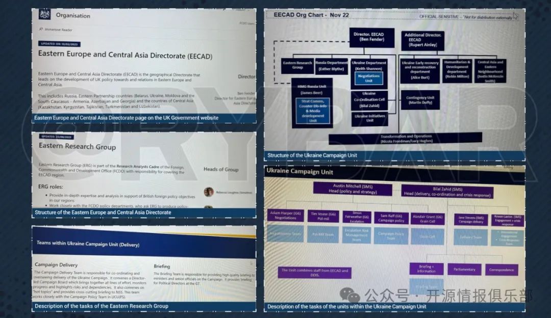 主要部門之一是東歐和中亞局(Eastern Europe and Central Asia Directorate;EECAD),該局被納入軍情六處的架構中,並於2022年大幅擴張。在他的領導下,這些行動以“打擊虛假信息和媒體發展計劃”等名義開展,主要參與者是英國廣播公司、路透社和Bellingcat。