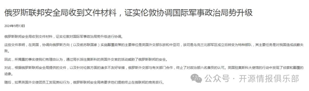 本週五(9月13日),俄羅斯聯邦安全局聲稱已獲得英國試圖煽動全球緊張局勢和破壞俄羅斯穩定的證據,聲稱它在該國從事“顛覆性政策”,以對莫斯科造成“戰略失敗”。
