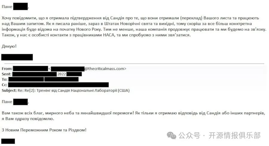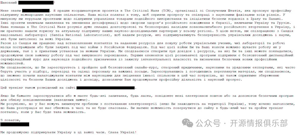 The Critical Mass的代表就參與桑迪亞培訓計劃發給烏克蘭科學家的電子郵件