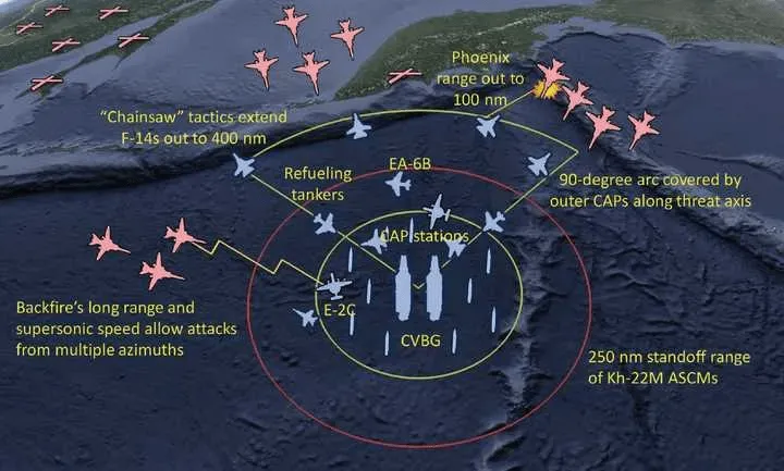 F-14A戰鬥機分為兩個4機梯隊前出350海里,使用的“不死鳥”導彈可以管60海里左右,形成主要威脅方向上,超過400海里的前出火力範圍。