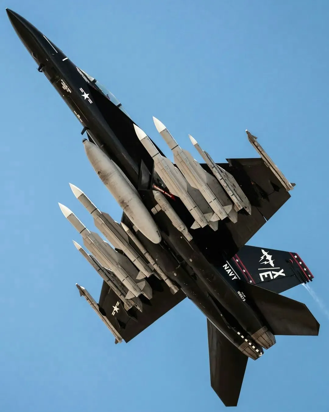 當然這些都不是重點,重點在於這架編號166673號的F/A-18F戰鬥機的掛架掛了個滿滿當當,除了2枚AIM-9X和3枚AIM-120D,最大的亮點在於機翼下方掛載了足足4枚AIM-174B型超遠程空對空導彈,説是AIM-174B,實際就是艦載RIM-174“標準-6”艦空導彈的空射版本。