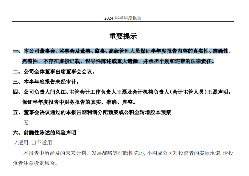 要知道在珍寶島2024年半年報的開篇就寫着:“本公司董事會、監事會及董事、監事、高級管理人員保證半年度報告內容的真實性、準確性、完整性,不存在虛假記載、誤導性陳述或重大遺漏,並承擔個別和連帶的法律責任。”