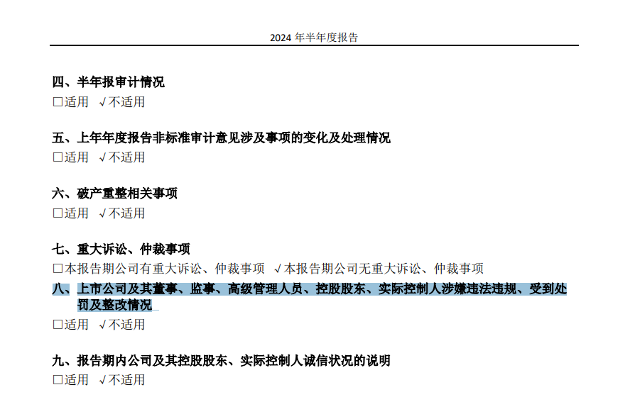 作者在黑龍江珍寶島藥業股份有限公司《2024年半年度報告》中看到,關於“上市公司及其董事、監事、高級管理人員、控股股東、實際控制人涉嫌違法違規、受到處罰及整改情況”一節中,表示“不適用”,意思就是報告期內未發生上市公司及董監高、控股股東、實控人等涉嫌違法違規、受到處罰及整改等情況。