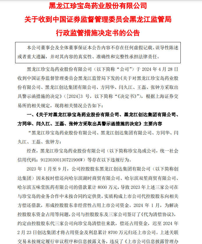 因為就在今年4月30日,上市公司珍寶島就發佈了一則公告,公告顯示,上市公司珍寶島在今年4月28日就收到中國證券監督管理委員會黑龍江監管局下發的《關於對黑龍江珍寶島藥業股份有限公司、黑龍江創達集團有限公司、方同華、閆久江、王磊、張鍾方採取出具警示函措施的決定》([2024]3號)。