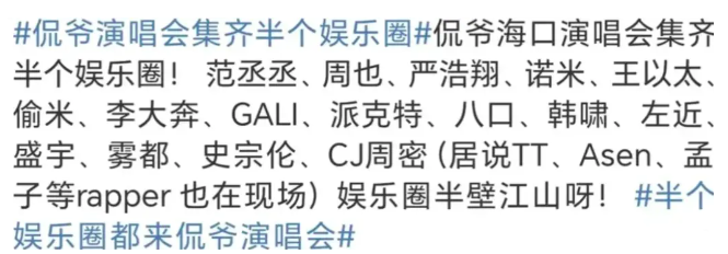 範丞丞、王以太、周也等不少內娛藝人都去看了侃爺在海口的演唱會,當天幾乎集齊了半個娛樂圈。