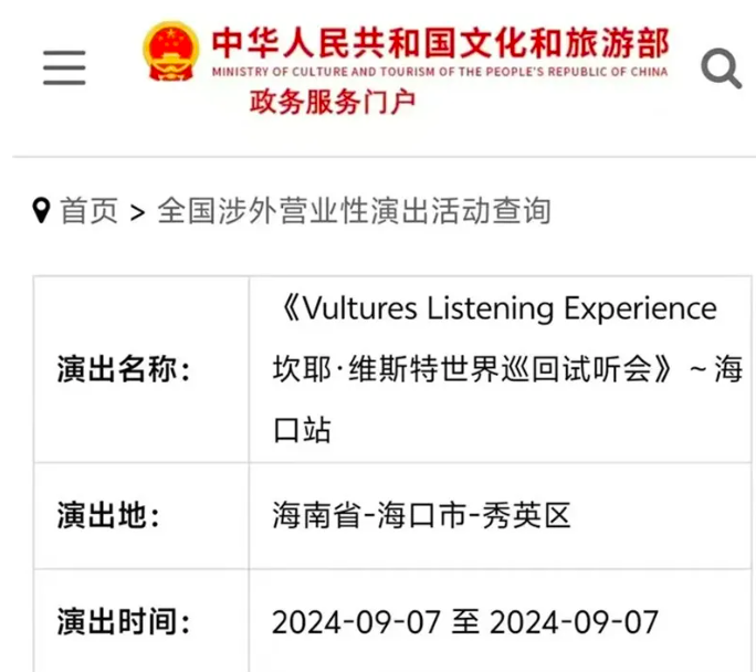 看到粉絲火爆的熱情,海口市旅文局更是有求必應,9月21日,坎耶·維斯特海口試聽會將在海口五源河體育場加演一場。