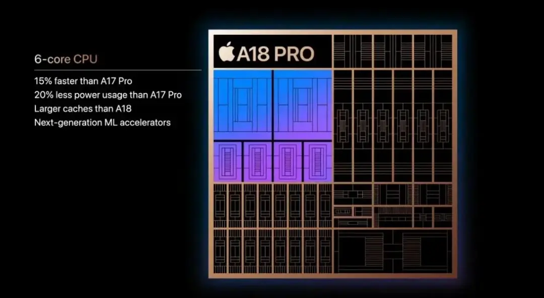 A18 Pro 採用最新的ArmV9指令集,包含6核 CPU(2個性能核心+4個能效核),性能核最高可達前所未有的 4.04GHz 頻率,這對於移動芯片組而言尚屬首次。此外,該芯片組還有4個能效核,可以運行大型生成式AI模型而優化的16核神經網絡。