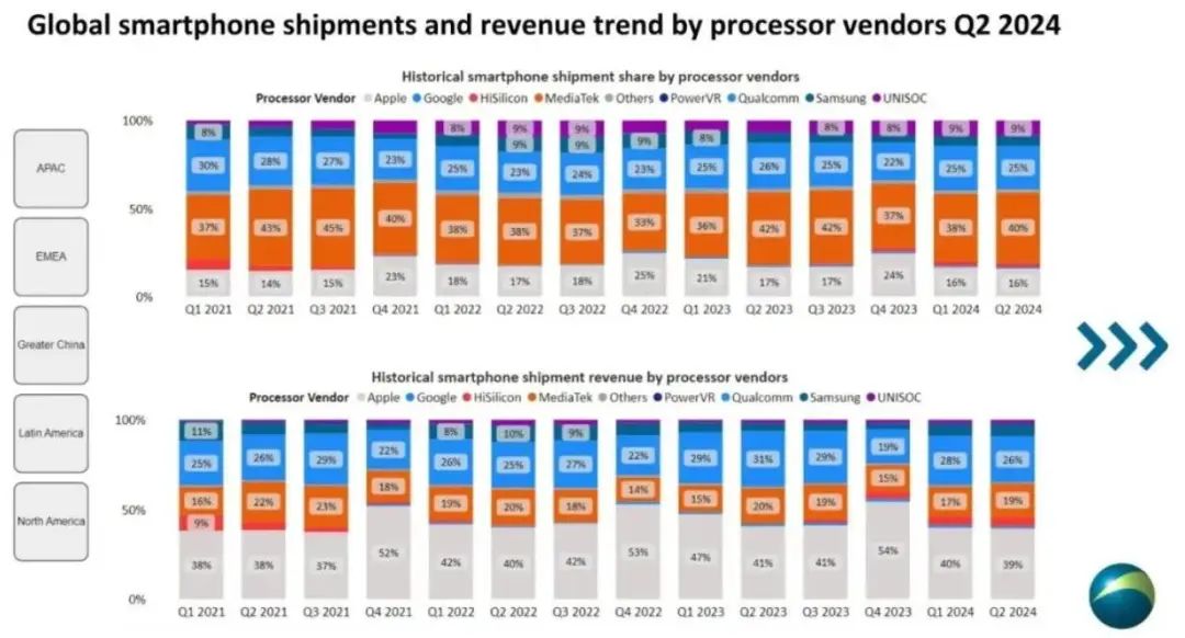 今年以來,智能手機市場出現復甦,特別是二季度全球智能手機加速復甦,AI的應用正在成為智能手機的重要組成部分,從影像處理到個性化推薦,這也對上游手機SoC芯片提出了新的技術要求。近日,Canalys發佈了2024年第二季度手機SoC市場的廠商分析報告。本文重點來分析手機SoC廠商近期市場表現和新品搭載旗艦芯片的亮點。