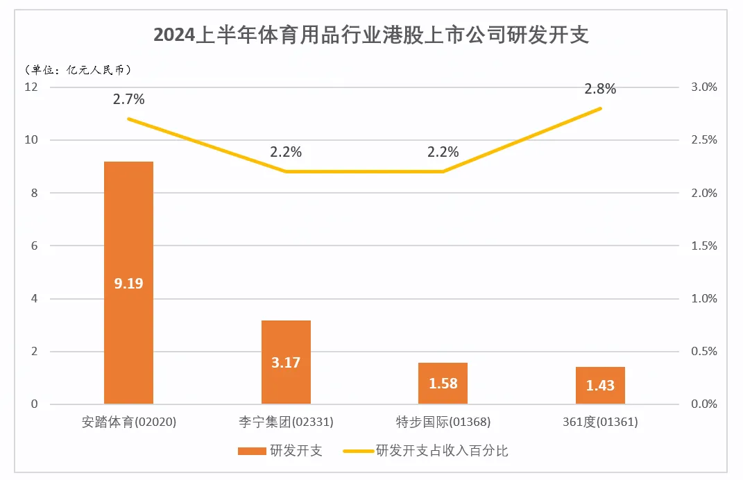財報數據顯示,2024年上半年,安踏研發投入超9億元,同比增長35.7%,但是在研發投入佔收入百分比方面,略高於李寧、特步的2.2%,卻低於361度的2.8%。