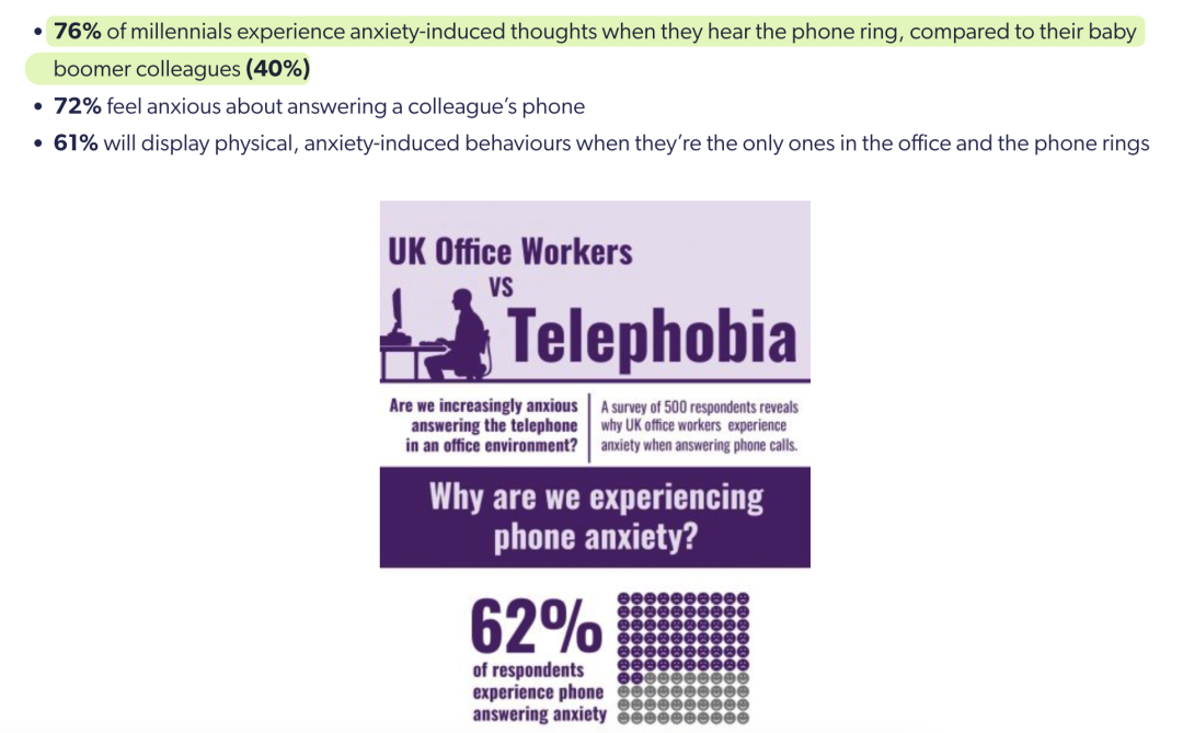 2019 年英國有一項調查發現, 500 名上班族中有 62% 的人在接電話時會焦慮,其中千禧一代中會焦慮的人達到 76% 。