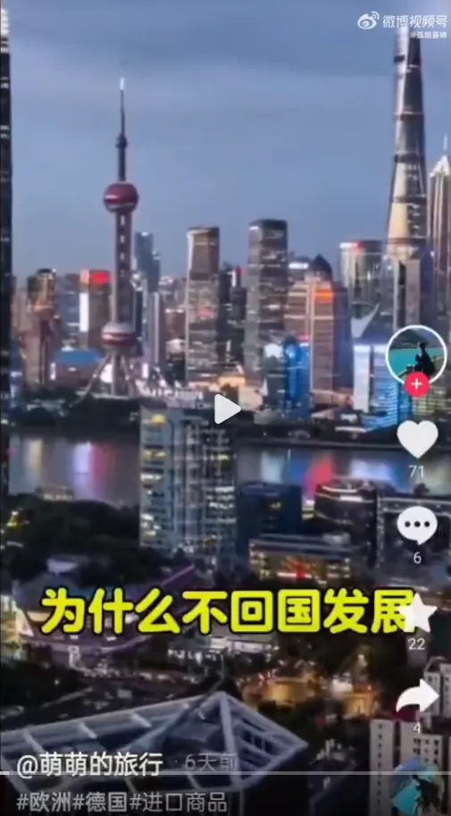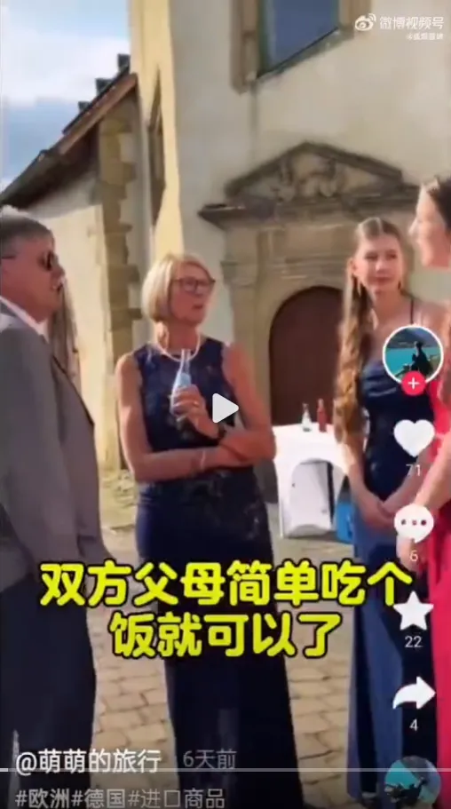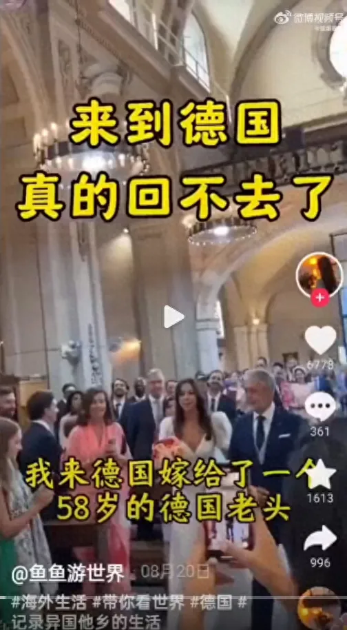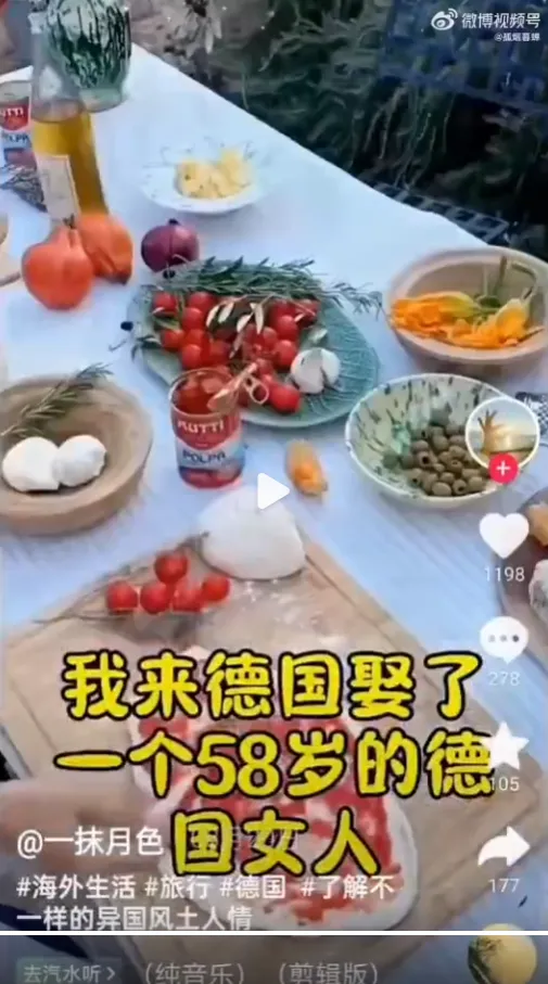 “我來到德國嫁給/娶了一個58、9歲的德國老頭/老太太,很多人就罵我是賣國賊,罵我不知廉恥,但是不管怎麼説,在德國結婚是沒有彩禮的,父母聚在一起簡單吃個飯就行了,大家都很開明……最近很多朋友問我,中國現在那麼好,為什麼不回國發展,説實話回不去了,也不敢回去,像我們這種學歷的人,在國內一個月只能掙個幾千塊錢,但在德國卻可以掙個三四萬,關鍵在德國一天只需要工作6個小時,而且還不用加班……”