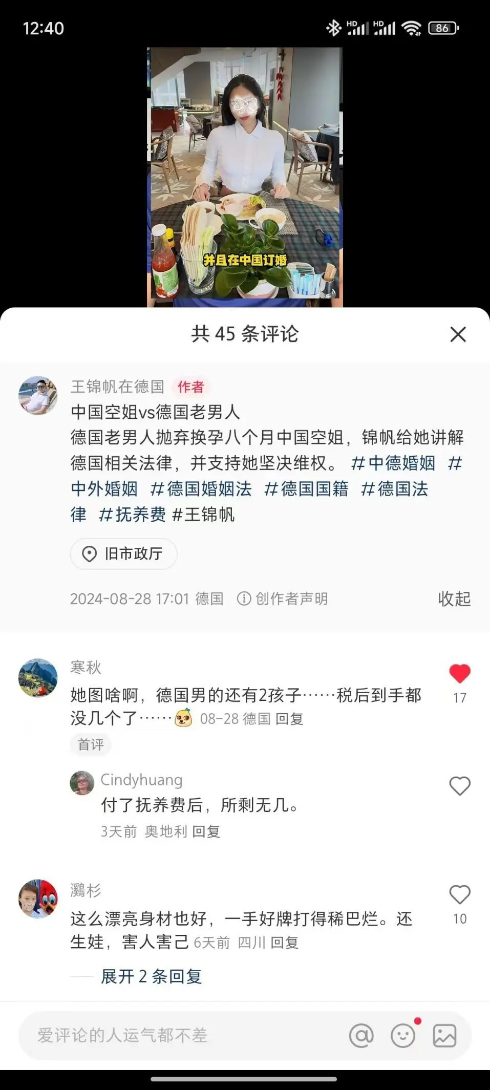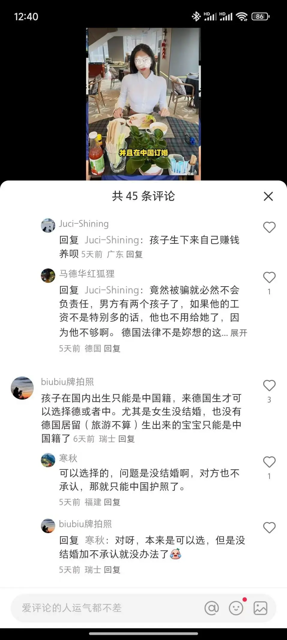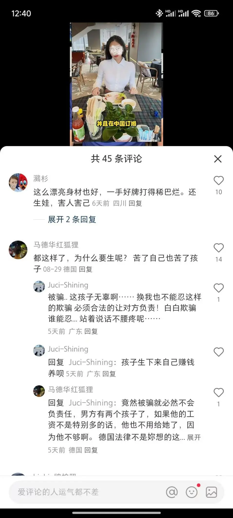 而且,根據女當事人和Vlog博主後來的連線聊天得知,那個德國老男人其實結過婚的,在她懷孕之前在德國就已經有兩個孩子了,現在還在養着呢。